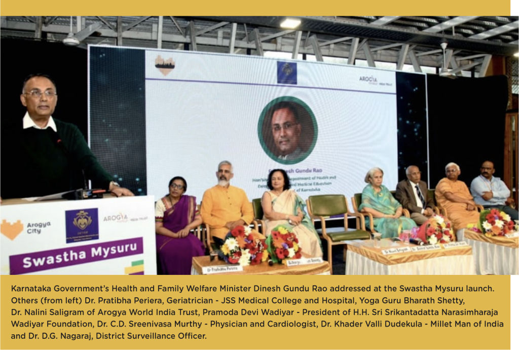 In December 2025, in collaboration with the HH Sri Srikantadatta Narasimharaja Wadiyar Foundation, Swastha Mysuru was launched, a second city-wide movement under the Arogya City initiative. Karnataka’s health minister Mr Dinesh Gundu Rao spoke at the event and was very positive about our efforts.